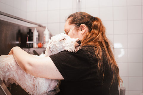 - Hundbad med rasanpassande schampoo (återfuktande/texture)